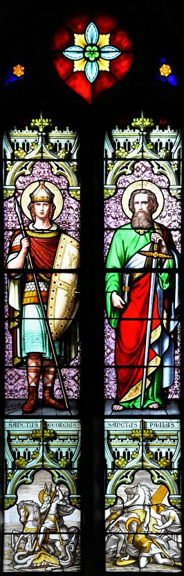 Soubassement du vitrail de saint Georges et de saint Paul.