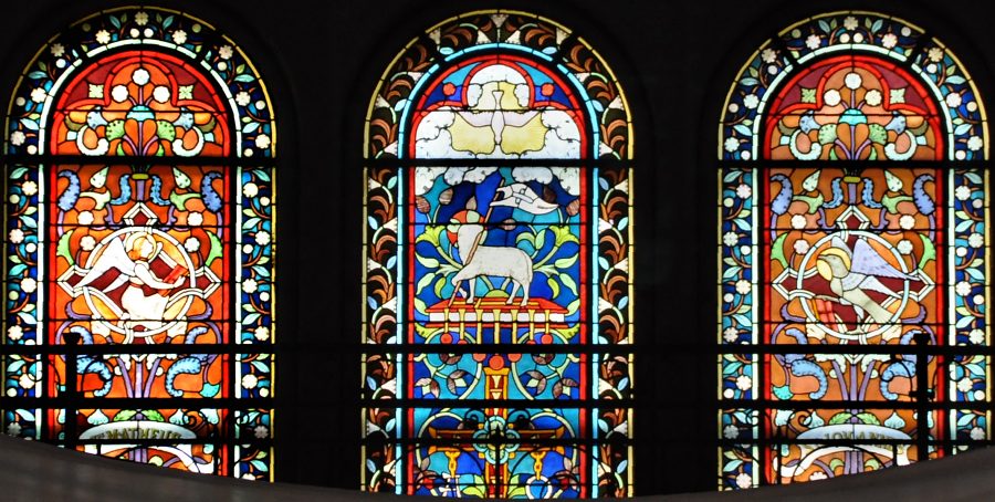 Au premier niveau, la verrière historiée. Au second, des vitraux à