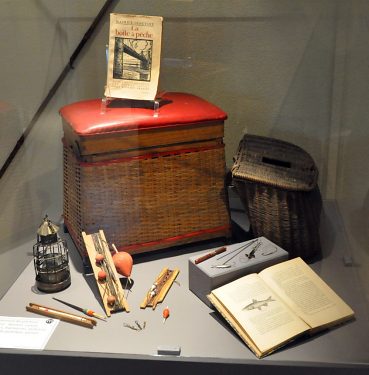 Besace, canne, flotteurs, hameçons, lanterne, panier-siège,
