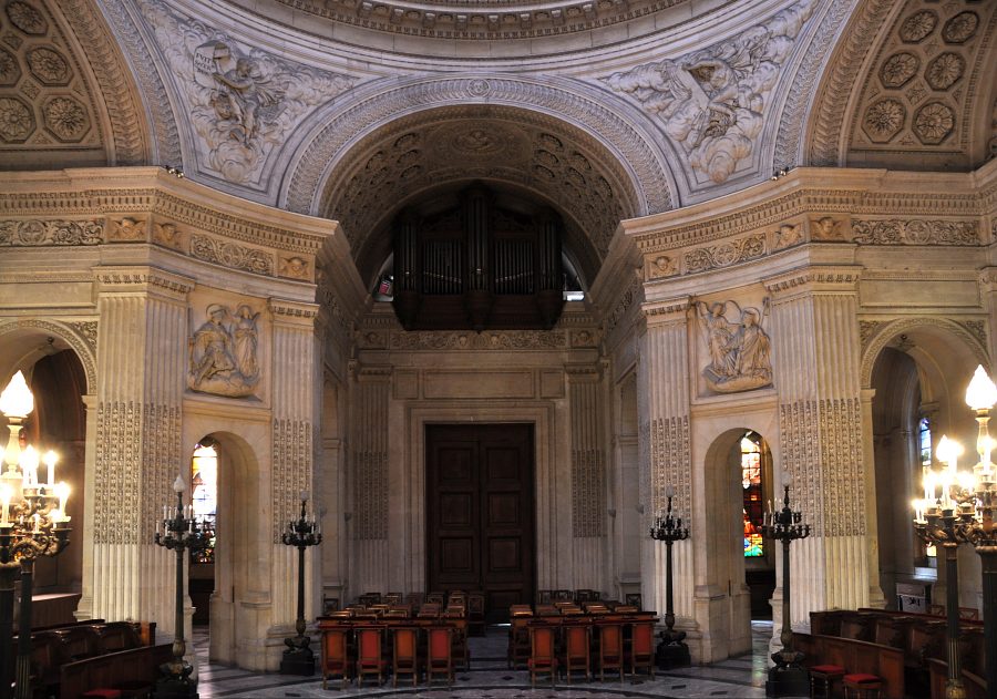 Vue générale de la nef avec ses sculptures et ses bas-reliefs.