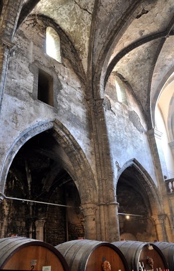 Les arcades du côté sud et les tonneaux du caveau viticole