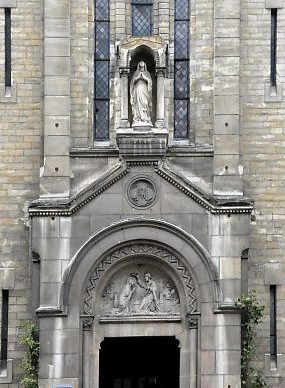 Bas-relief et statue ornent le portail d'inspiration romane. |