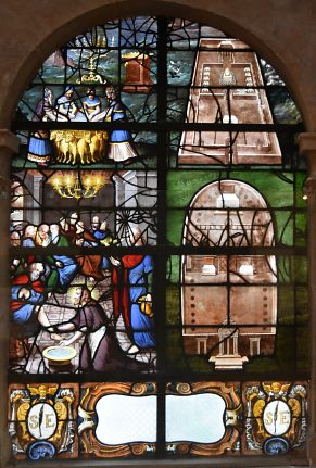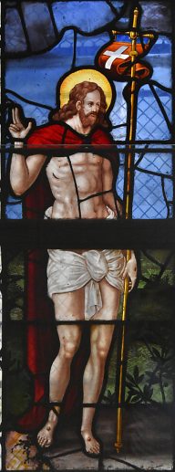 Dans le vitrail de la galerie des Charniers, le Christ