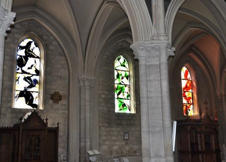 Bas-côté droit avec trois des vitraux créés par le père Kim