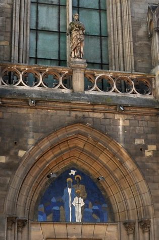 Une mosaïque de la Sainte Famille orne le tympan du portail néogothique. |