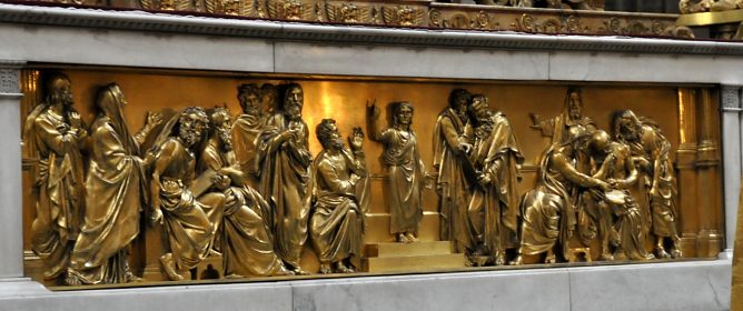 L'étage du haut est orné des statues des quatre évangélistes. |